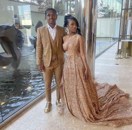 Vestido de fiesta con lentejuelas en oro rosa brillante y cola, vestido de noche sexy Y1436