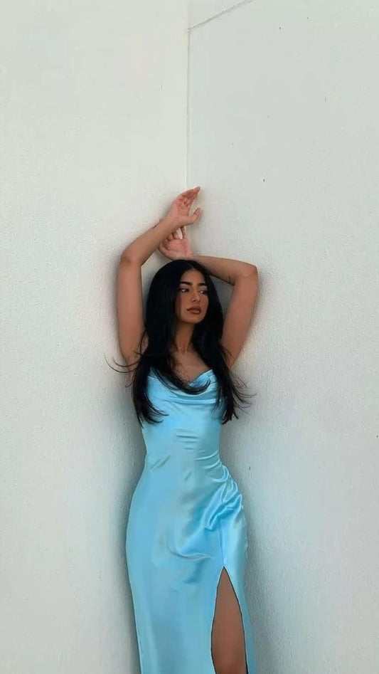 Vestido de noche largo de satén azul cielo con escote corazón y corte sirena sexy Y1732