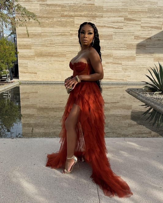 Vestido de noche largo sin tirantes con abertura alta Vestido de noche glamoroso Y45
