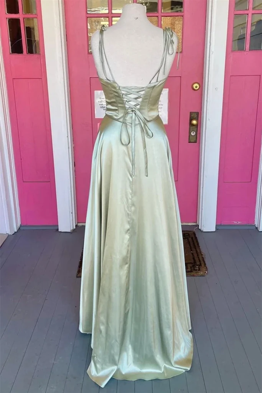 Vestido de fiesta largo de satén color salvia con espalda abierta y abertura alta, vestido de noche formal de graduación color salvia largo Y207