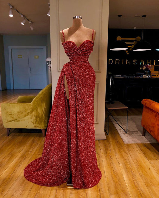 Vestido de fiesta sexy de sirena largo con tirantes finos y lentejuelas con abertura