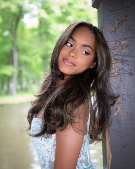 Elegante vestido de fiesta largo azul cielo de satén con pedrería y mangas largas.