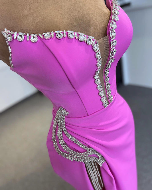 Vestidos de fiesta de diseñador con escote en V, sin tirantes, sin mangas, con cristales, tul y satén, con abertura frontal