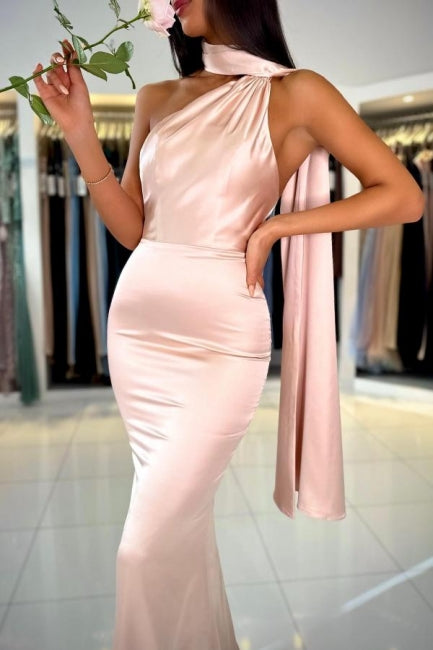 Elegante vestido de fiesta de satén rosa largo, sencillo, de sirena, con un solo hombro y sin mangas