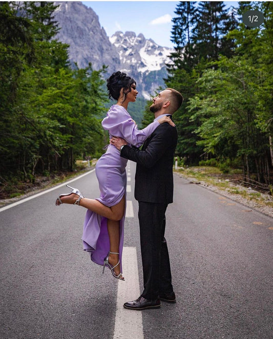 Hermoso vestido de fiesta largo color lila con escote en V y mangas largas con abertura