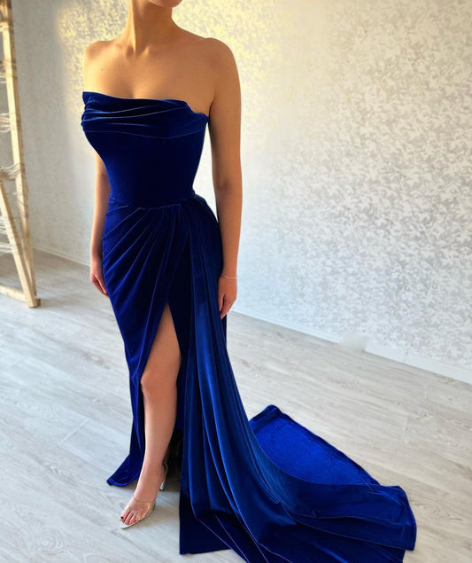 Vestido de fiesta azul real con abertura frontal, sin tirantes, con volantes y largo hasta el suelo
