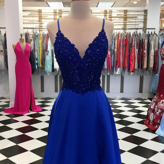 Vestidos de fiesta largos azul real de satén con lentejuelas, escote en V y corte A