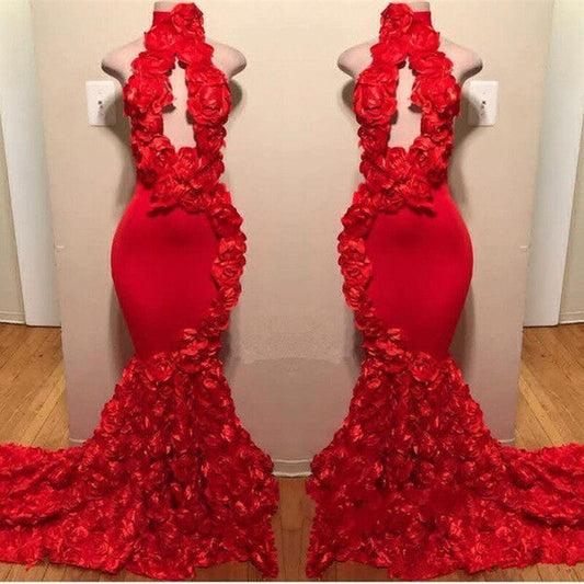 Vestidos de fiesta rojos sexys de cuello alto con flores y sirena larga
