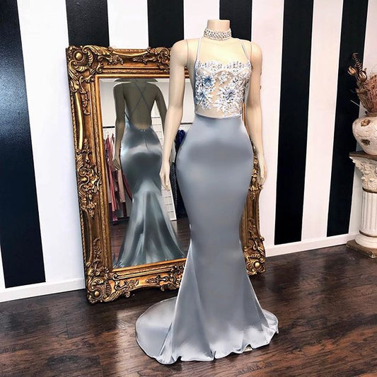 Vestidos de fiesta de sirena con cuello halter largo color champán, sexys, con escote en V y espalda descubierta.