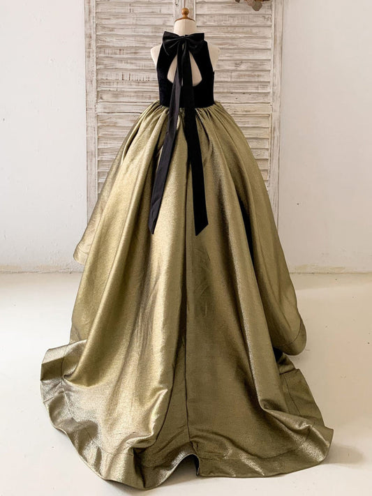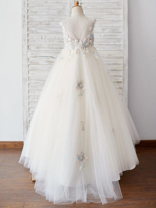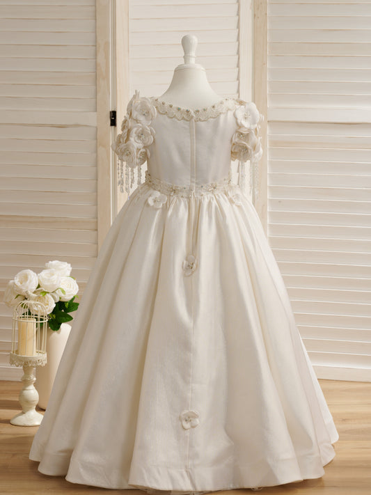 Vestido de niña de las flores de primera comunión color marfil con cola larga de tul y corte A