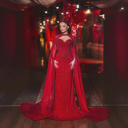 Vestido de noche de sirena rojo de lujo con cuentas y mangas estilo capa LA72811A