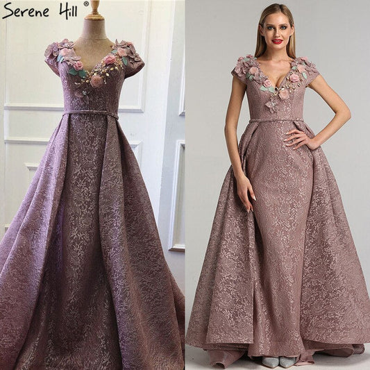En oferta, sin devolución ni reembolso. Vestidos de noche morados con escote en V, flores hechas a mano, encaje, 2025, sin mangas, sirena, sexys, LA60764