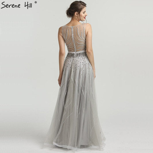 En oferta, sin devolución ni reembolso. Vestidos de noche de lujo con cuentas de diamantes grises 2025. Vestidos de noche formales de playa sin mangas sexys de alta gama LA6577.