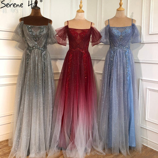 En oferta, sin devoluciones ni reembolsos, sin mangas, sencillo, de moda, azul, vestido de noche elegante de gasa con cristales, vestido de noche Bezch 2025, foto real HA2177