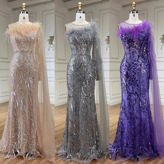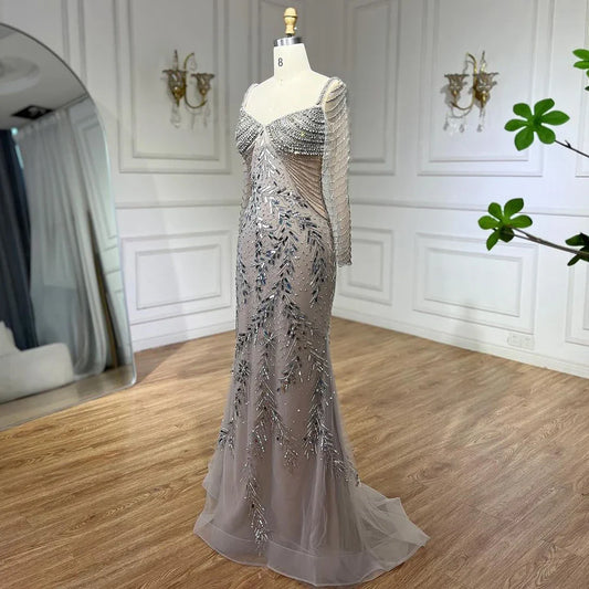 Vestidos de noche estilo sirena estilo árabe, color plata nude, con mangas largas y cuentas, estilo Dubai 2025, elegantes vestidos de fiesta para mujer LA72183