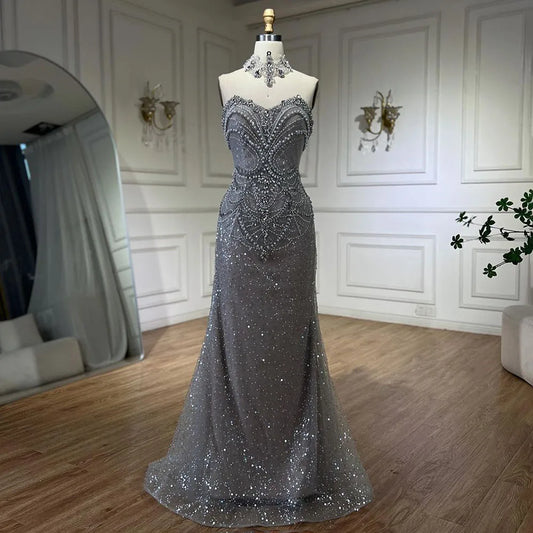 Vestidos de noche árabes de satén sirena gris plateado sin tirantes, de lujo, con cuentas, para mujer, para fiesta de boda, LA72349