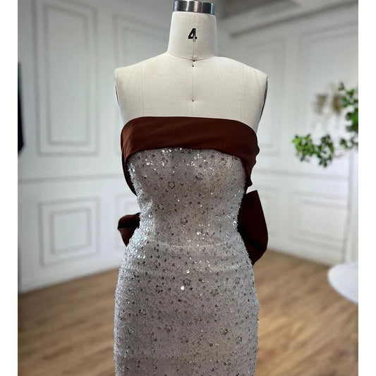 Vestidos de noche árabes beige elegantes de sirena, sexys, sin tirantes y con cuentas, 2025, para mujer, fiesta de boda LA72065