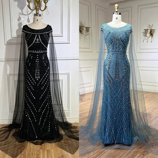 Vestido de sirena árabe negro con mangas estilo capa y cuentas de lujo | Vestidos de noche para mujer, fiesta de bodas 2025 LA72423