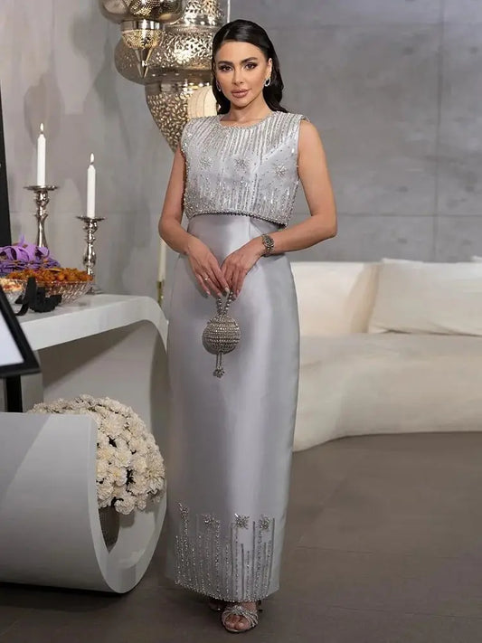 Vestido de noche formal midi gris de lujo con cuentas saudíes para ocasiones árabes LA72761