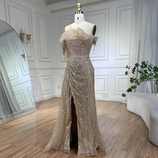 Vestido de noche estilo sirena de lujo de Dubái, con un hombro al descubierto y abertura, color piel, para mujer, para fiesta de boda, LA72385
