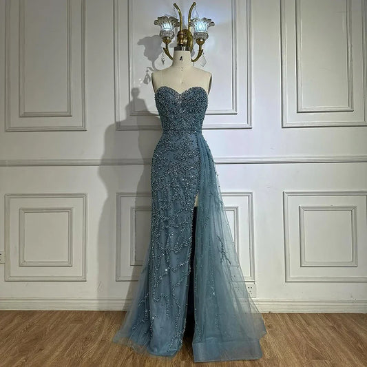 Vestido de noche de sirena azul saudí con hombros descubiertos y cuentas, con abertura lateral, para ocasiones formales (2025, LA72867)