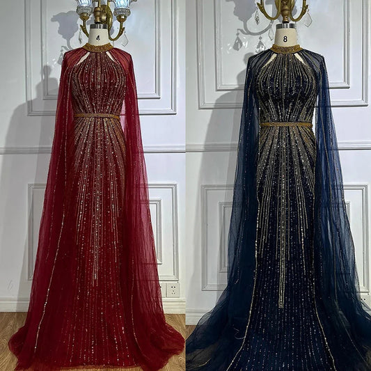 Vestido de noche saudí de sirena con cuentas en rojo vino 2025 y capa para ocasiones formales LA72707A