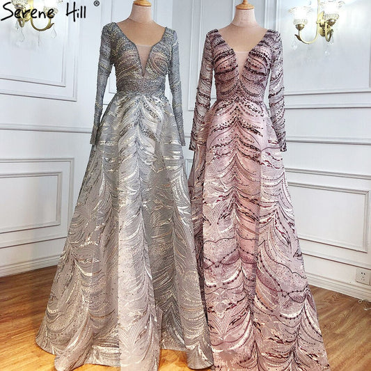 Vestidos de noche grises de corte A con cuentas, mangas largas tipo farol, de lujo, para mujer, fiesta, LA70964