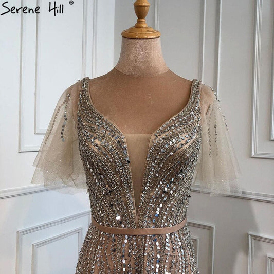 Vestidos de noche dorados de lujo con mangas cortas, vestidos de sirena 2025, elegantes con cuentas para mujer, fiesta LA70851