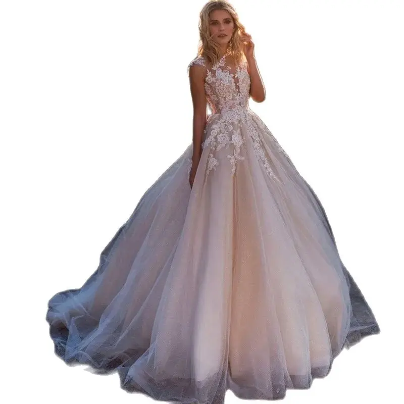 Hermoso vestido de novia de tul blanco, sin mangas, con cuello redondo y apliques de perlas de lujo, corte A y largo hasta el suelo.