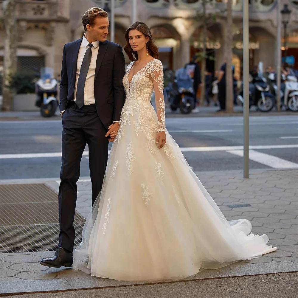 Hermosos vestidos de novia de manga larga en forma de A para mujer, con apliques de encaje, sexys vestidos de novia con cuello en V, estilo princesa, para fiesta de graduación, Mari