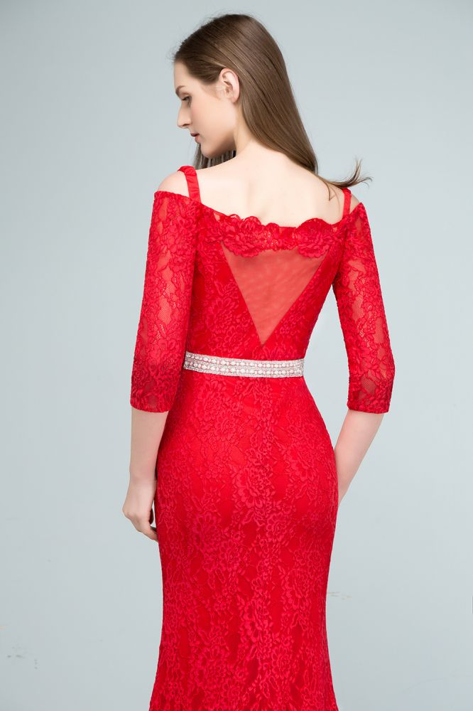 Vestidos de fiesta largos de sirena con hombros descubiertos, encaje, mangas y fajín
