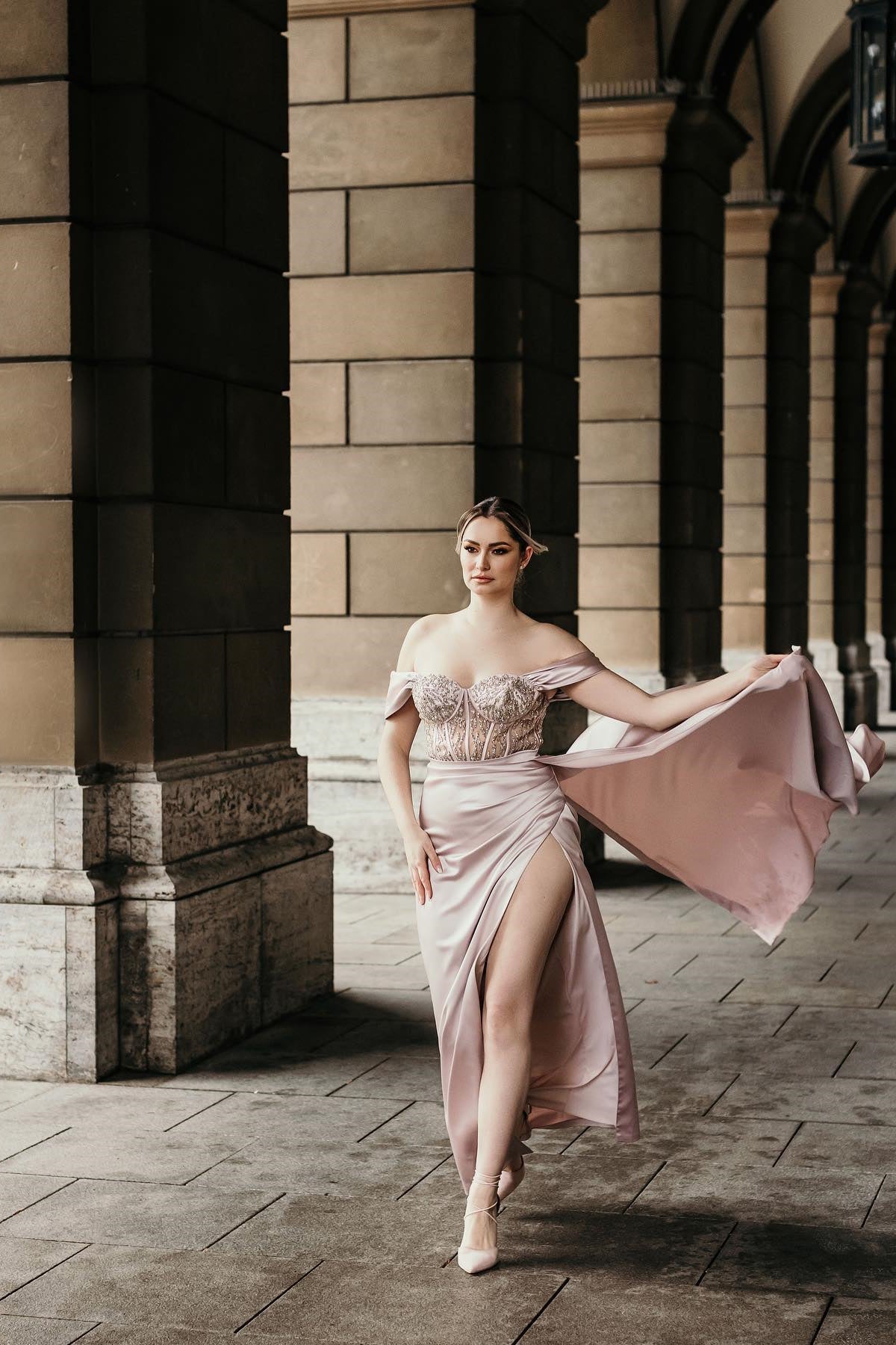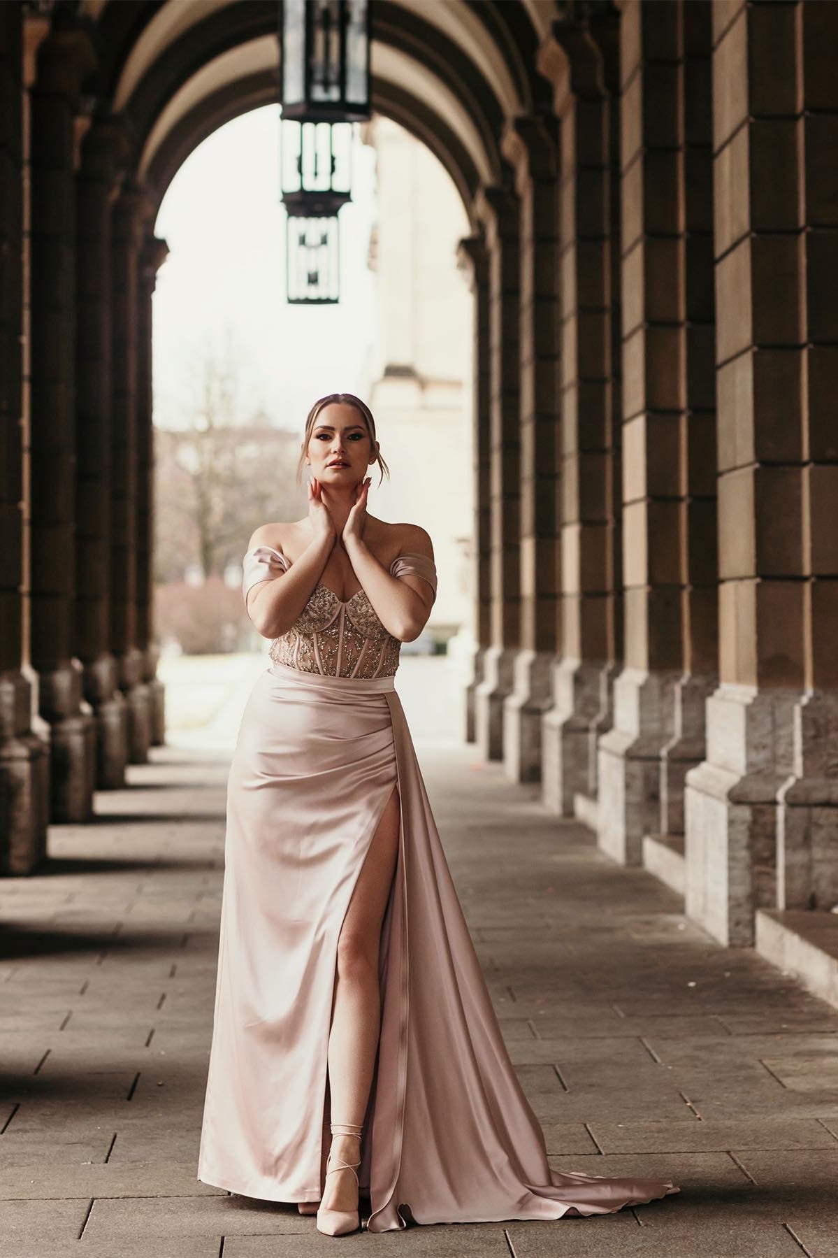 Vestido de fiesta de sirena de satén con hombros descubiertos, abertura lateral y cola desmontable