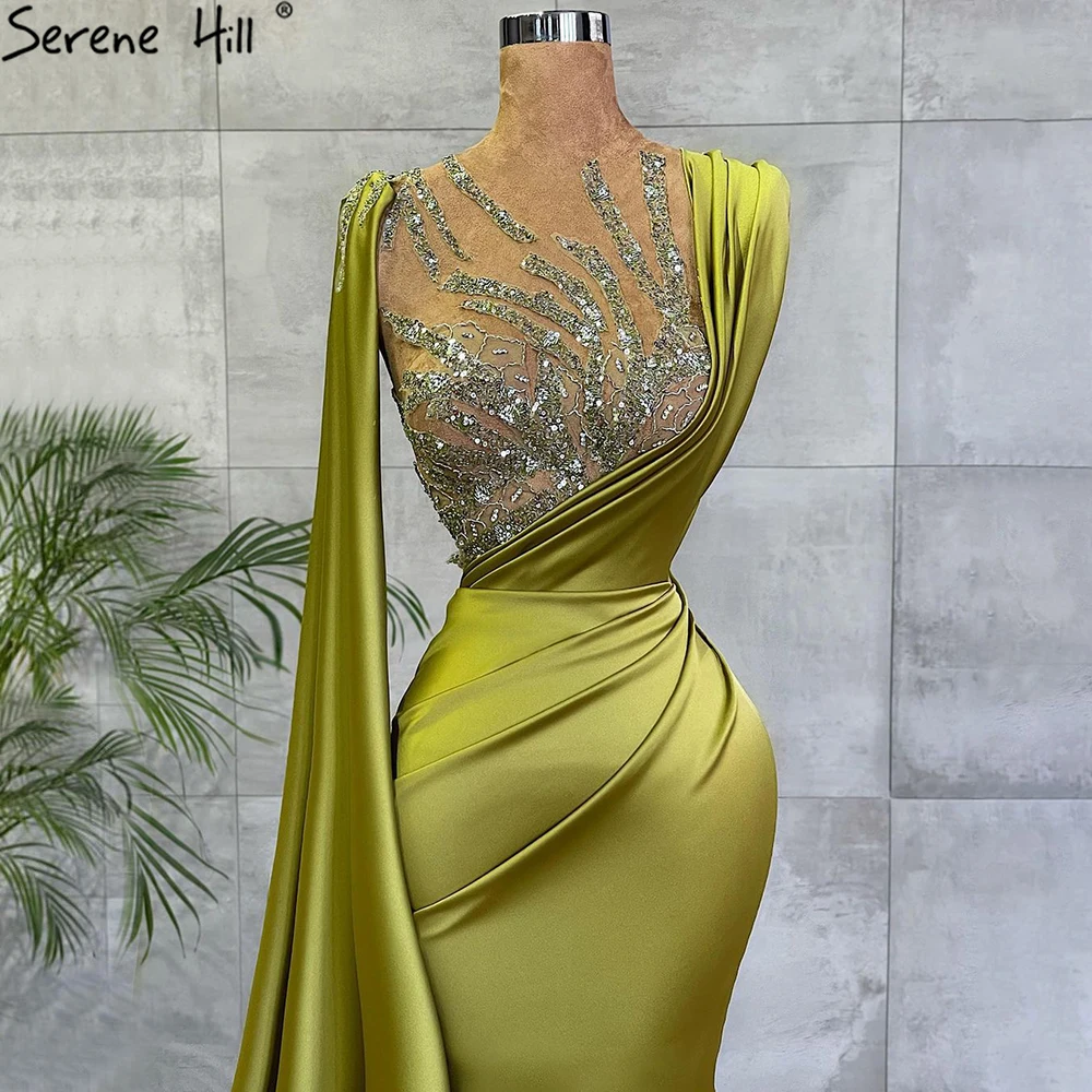 Vestido de noche de satén estilo sirena verde oliva 2025, elegante, con mangas estilo capa y cuentas, para mujer, fiesta LA71283