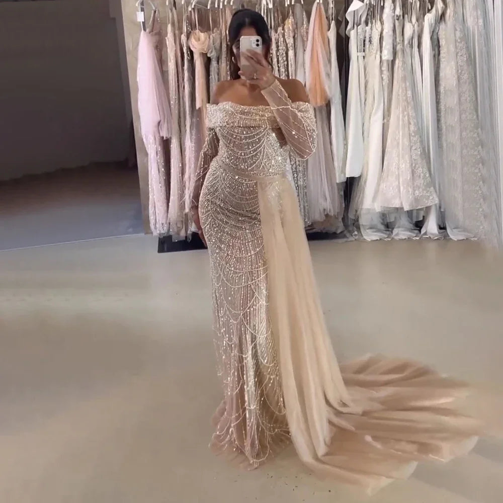 Vestido de noche sirena azul claro con hombros descubiertos y sobrefalda desmontable, Dubái LA72254