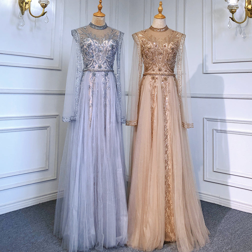 Vestidos de noche dorados de lujo con mangas tipo capa, vestidos de sirena con cuentas 2025, elegantes para mujer para fiesta LA71604