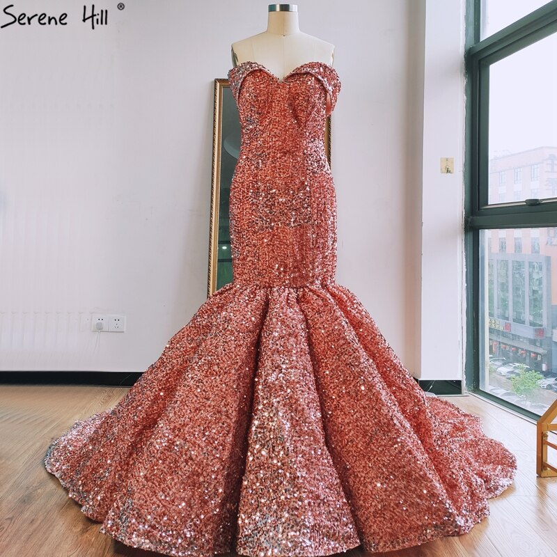 Vestidos de novia de sirena de lujo dorados, hombros descubiertos, brillantes, elegantes y sexys, HA2353