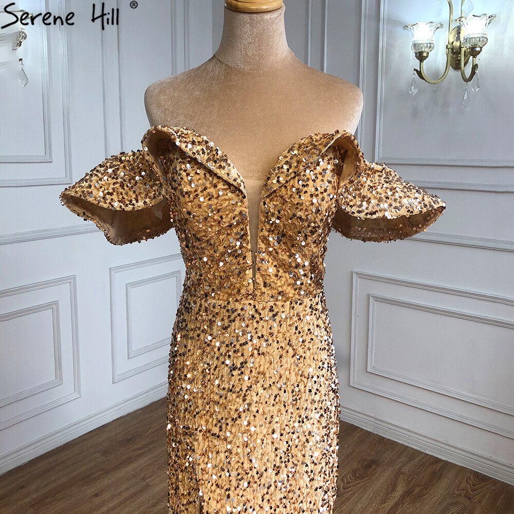 Vestidos de noche dorados de lujo, sexys, con abertura, corte sirena y cuentas, elegantes para mujer, para fiesta, LA70870