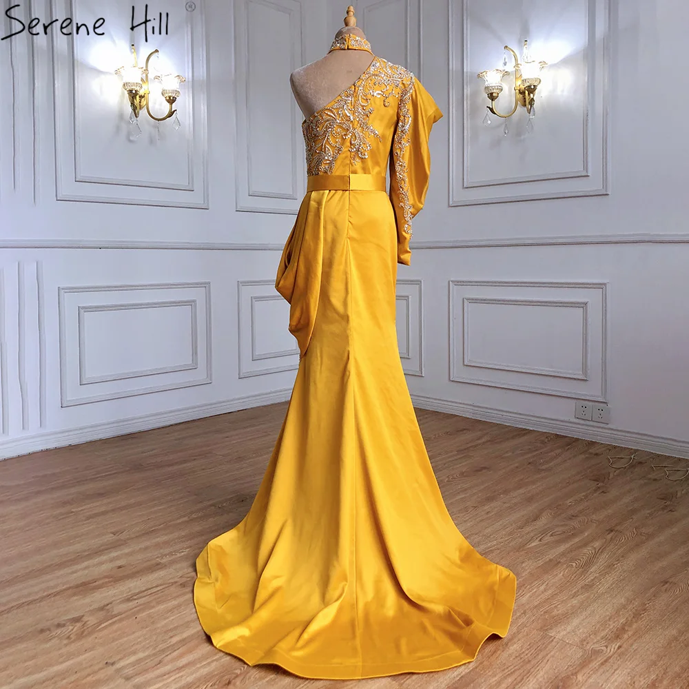 Vestidos de noche elegantes de satén con cuentas y corte sirena dorados, un hombro, para mujer, fiesta, LA71424