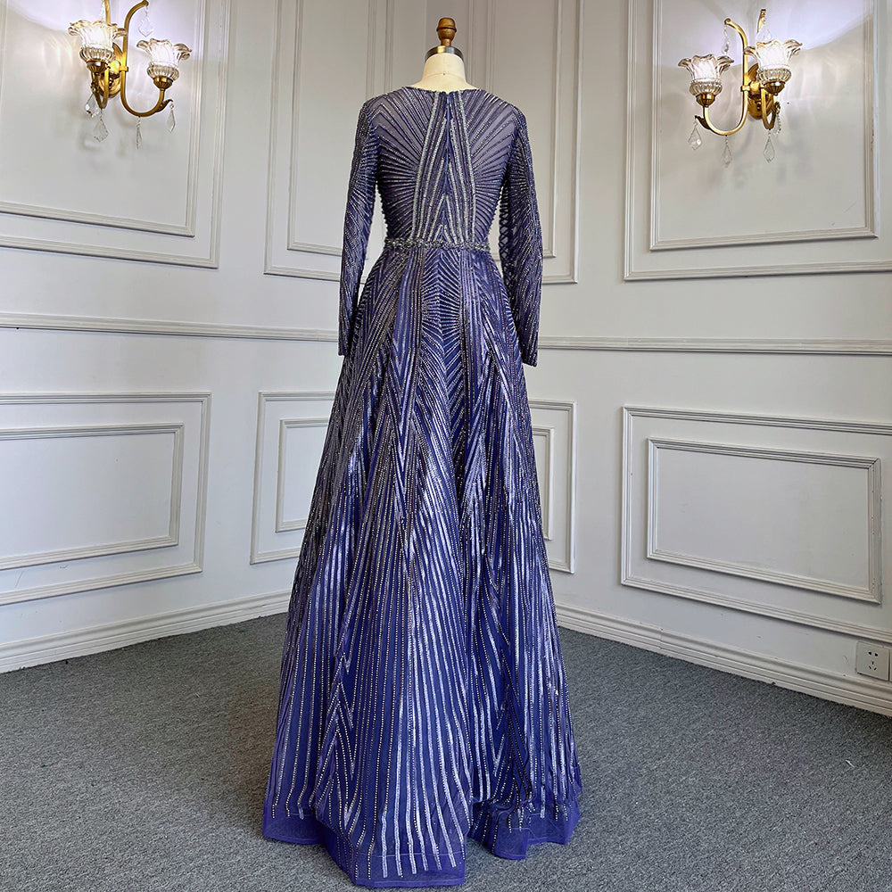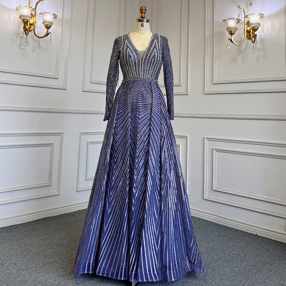 Vestidos de noche musulmanes dorados de corte A con escote en V y mangas largas, de lujo con cuentas 2025 para mujer, fiesta LA71701