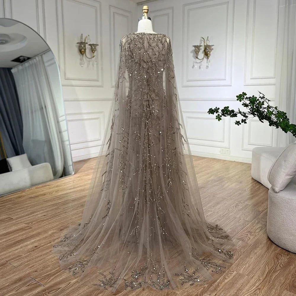 Vestidos de noche árabes de sirena gris, elegantes, con mangas estilo capa y cuentas de lujo, para mujer, para fiesta de bodas, LA72149