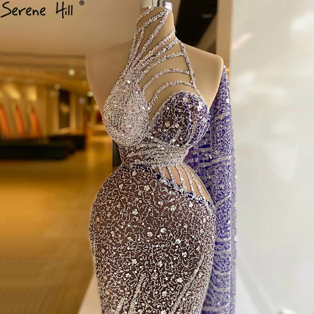 Elegante vestido de noche morado de sirena, con mangas abullonadas y cuentas, para mujer, para fiesta, LA71242