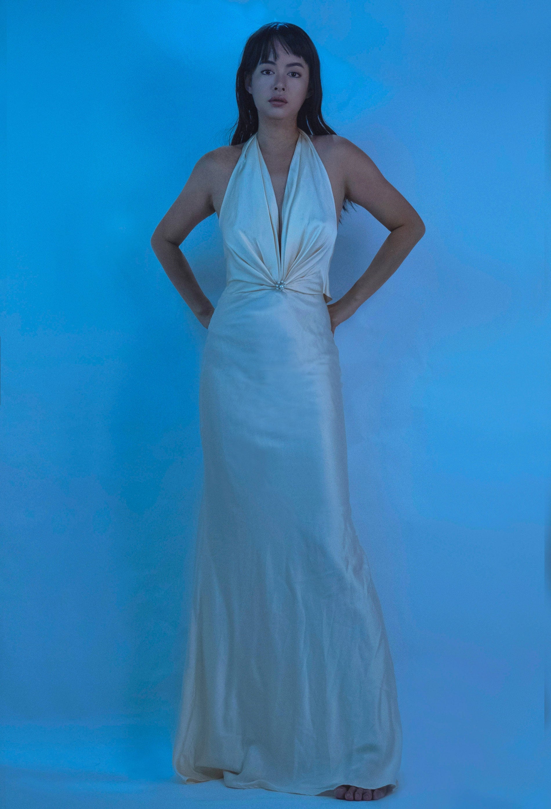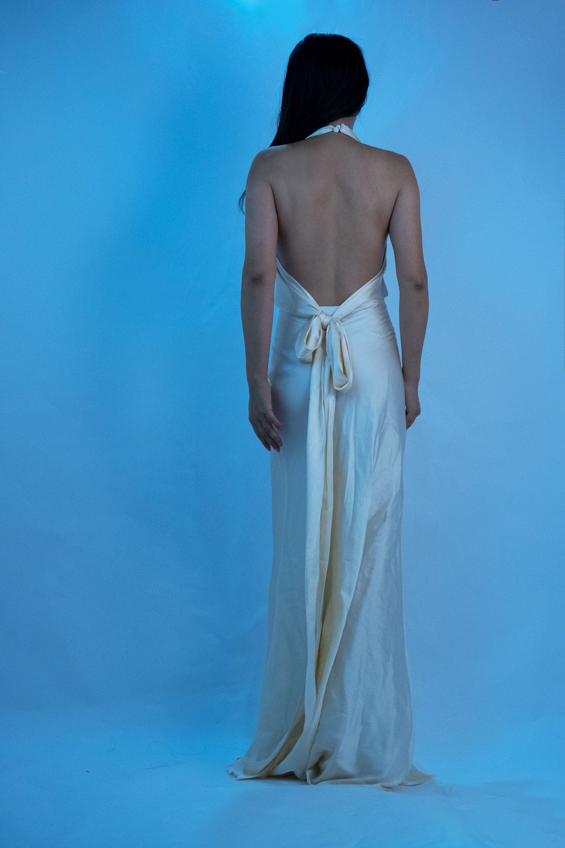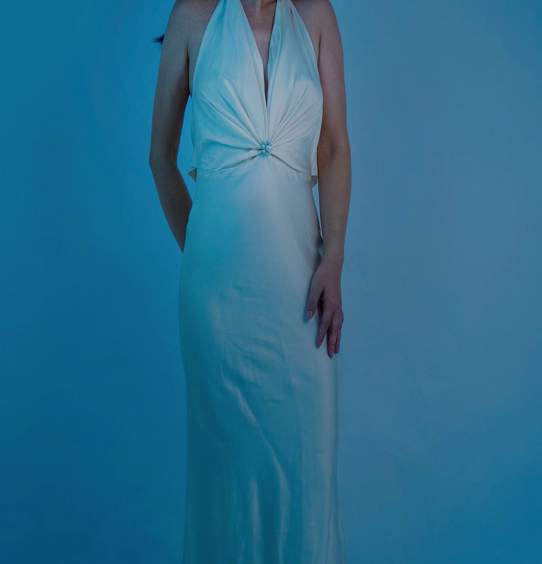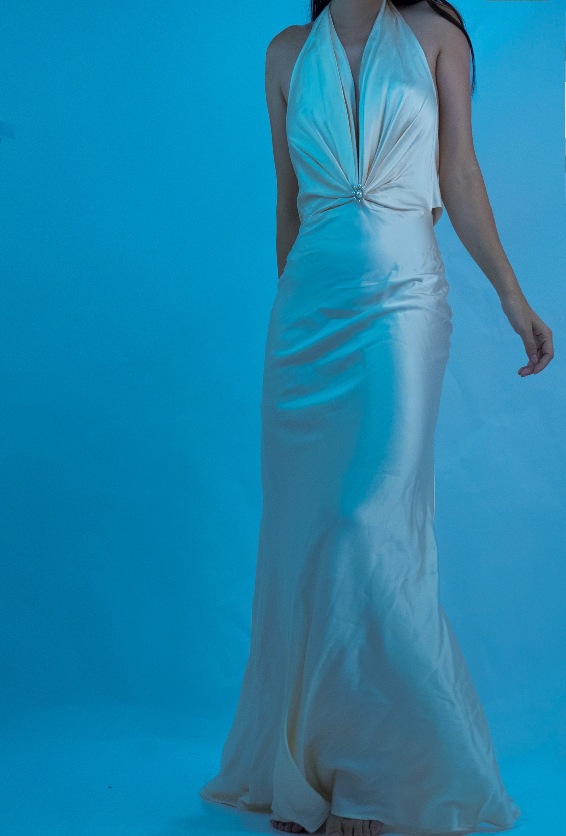 /100% Mulberry Silk Jewel Halter Neck Dress Gown Champagne White