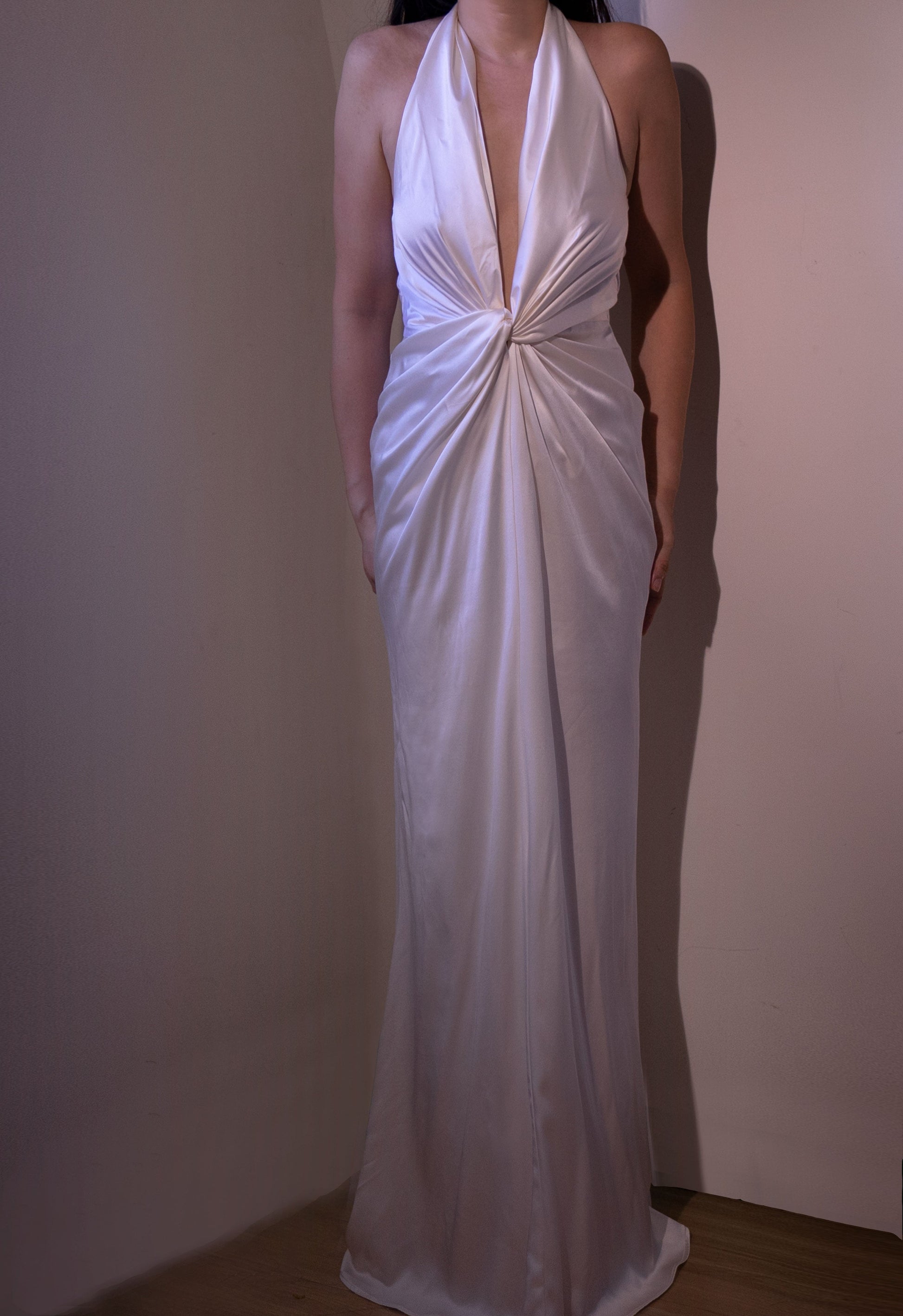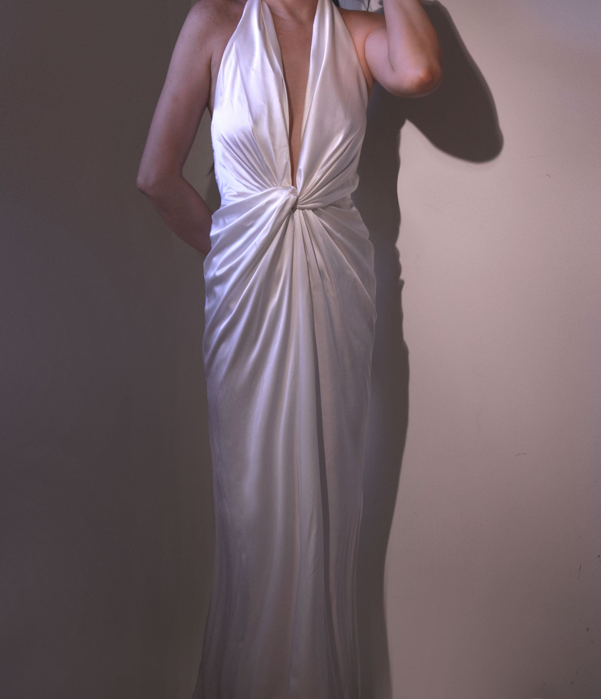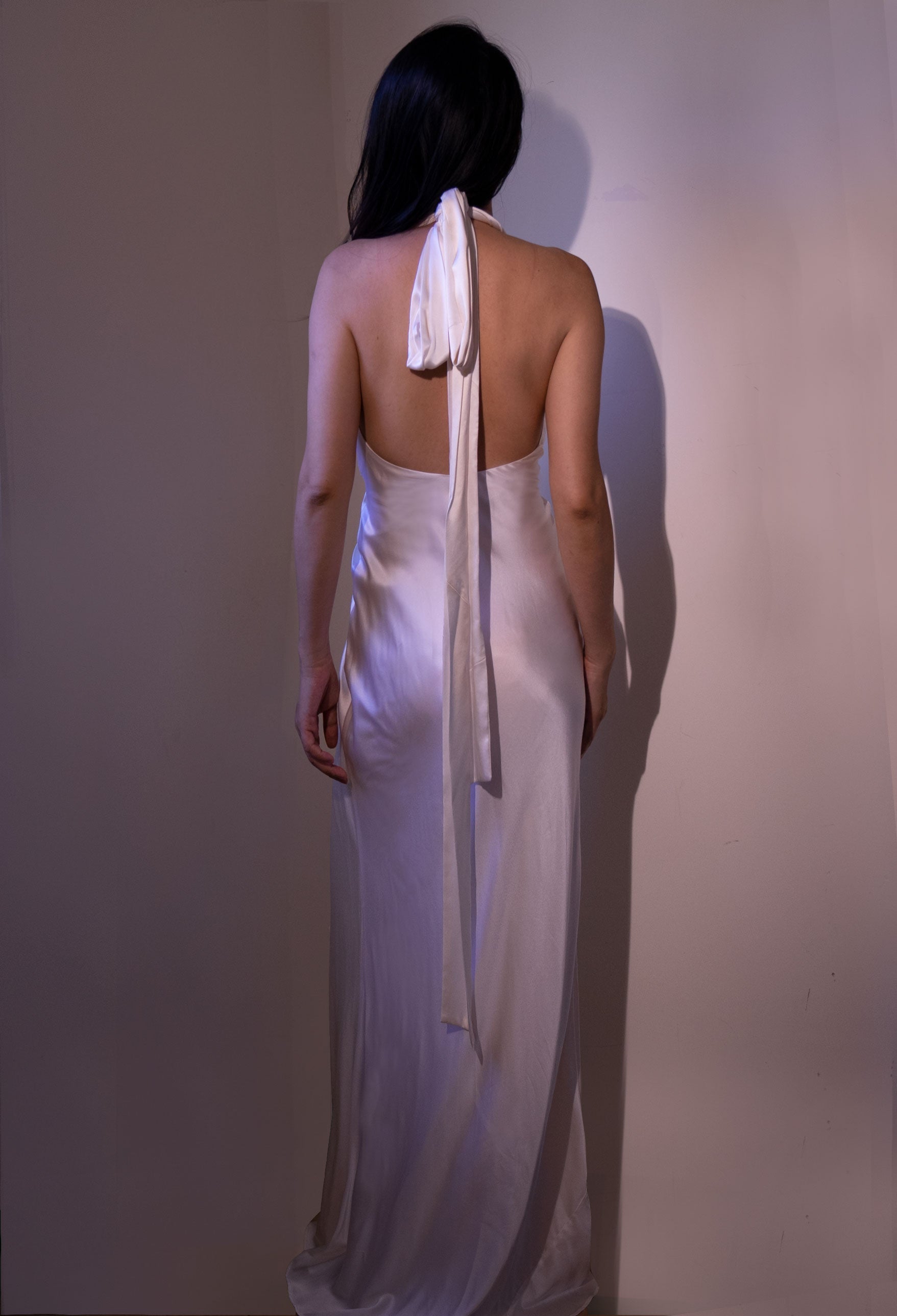 Hold the measuring tape at your hollow while a friend pulls it down to the length you want your dress.