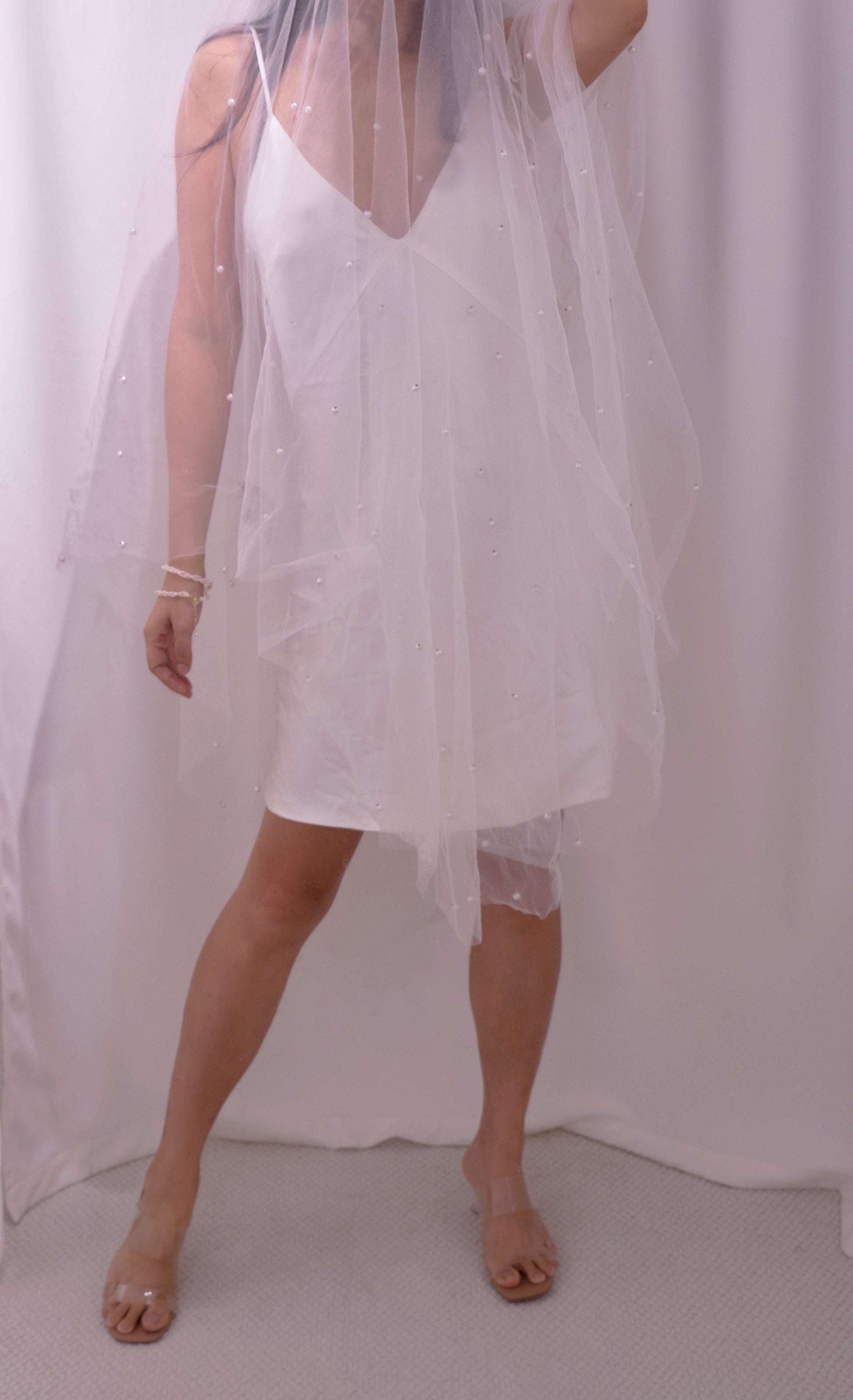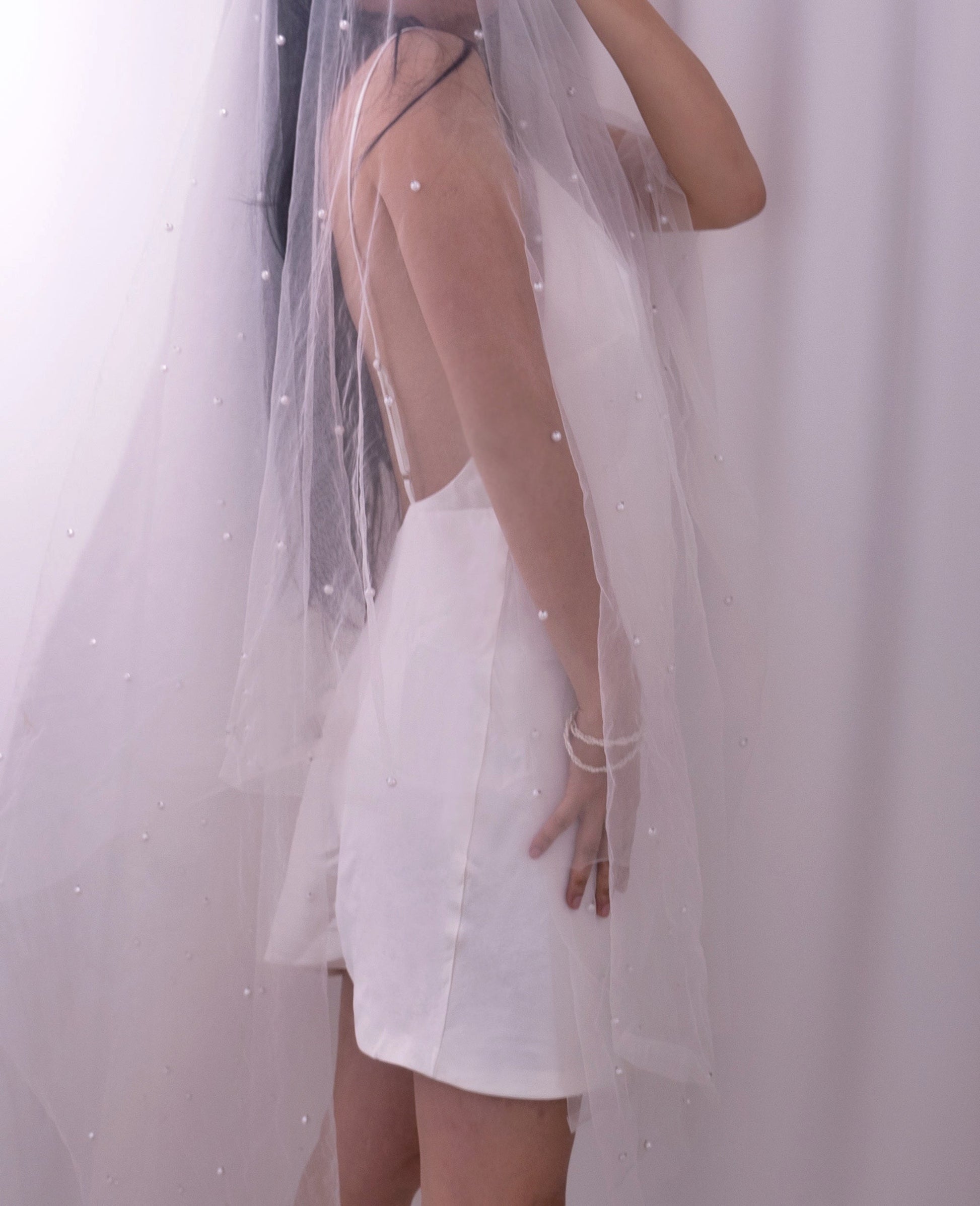 *The pearl-decorated mesh veil is available as a gift with the dress