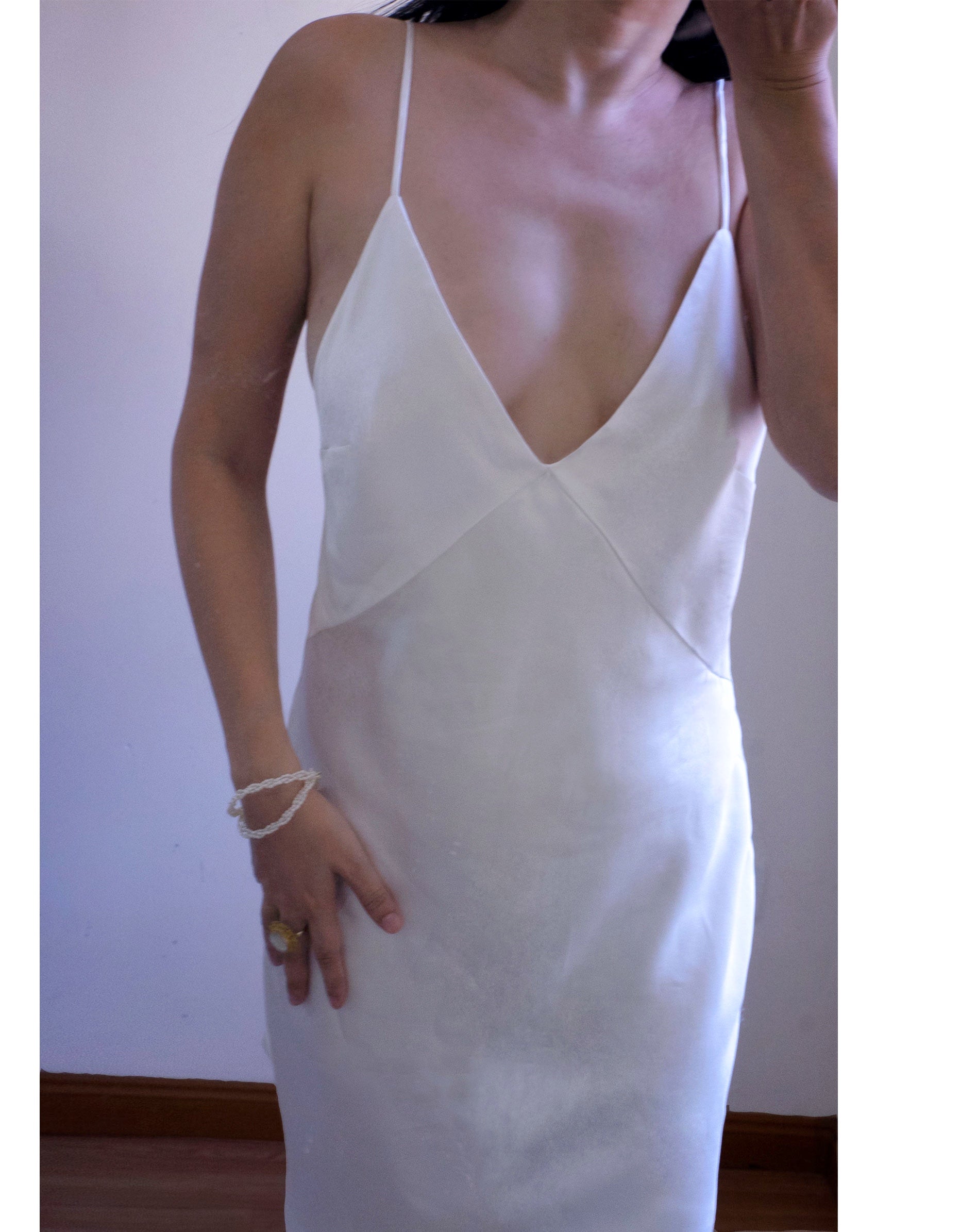 Hold the measuring tape at your hollow while a friend pulls it down to the length you want your dress.
