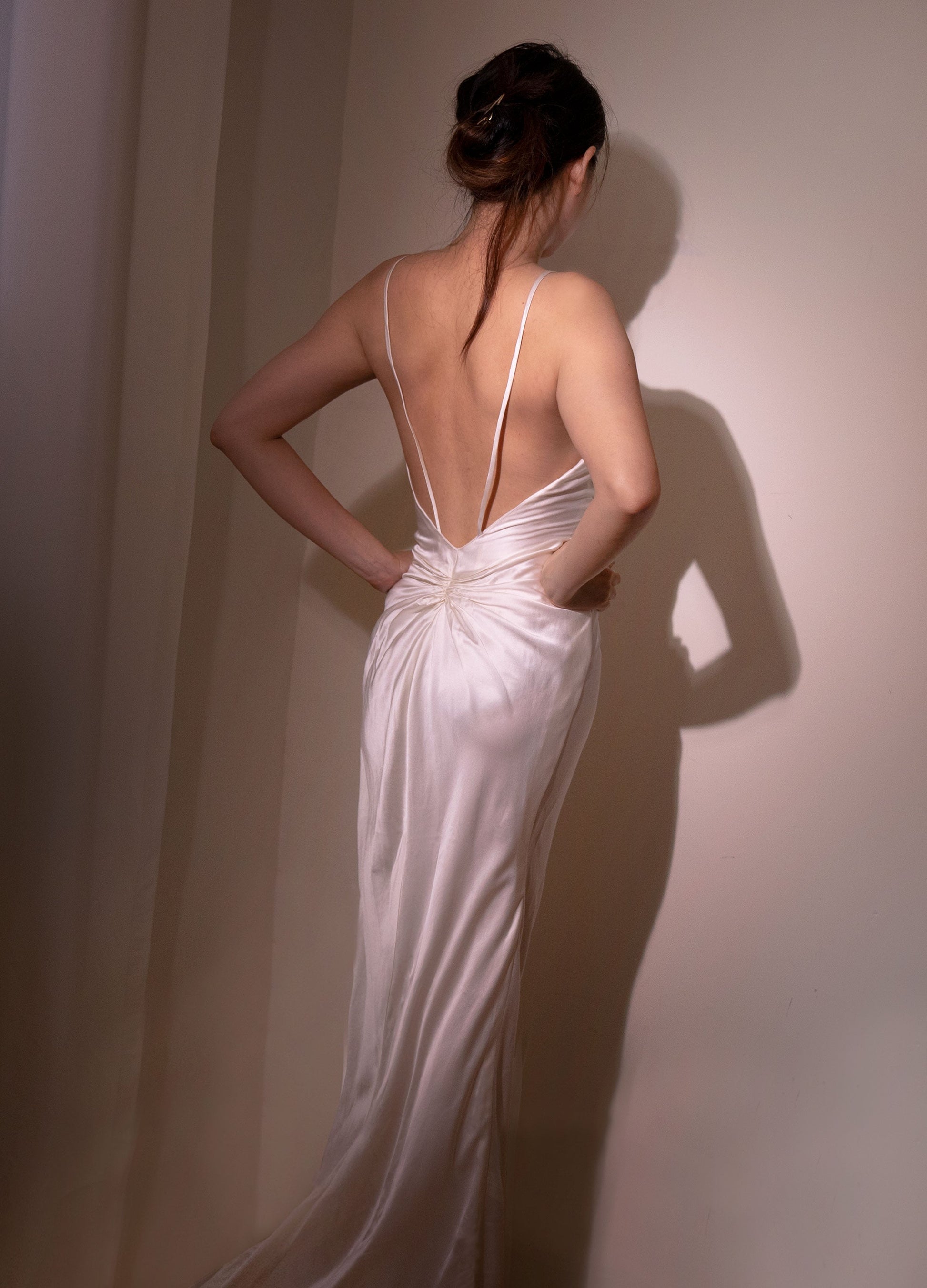 The Asia dress is the epitome of glamour and sophistication. This dress is finished with fine silk straps. an elegant bodice. and cowl neckline details. The center-back ruching and fit-and-flare silhouette accentuate your best assets. Our Made-to-Order Standard Asia comes with spaghetti straps. luxurious lining. and a 20cm train. Whether you're walking down the aisle or attending a black-tie event. the Asia dress is sure to make a statement and leave a lasting impression. With its luxurious details and impeccable fit. this dress is the perfect choice for the modern woman who wants to feel confident. beautiful. and unforgettable.