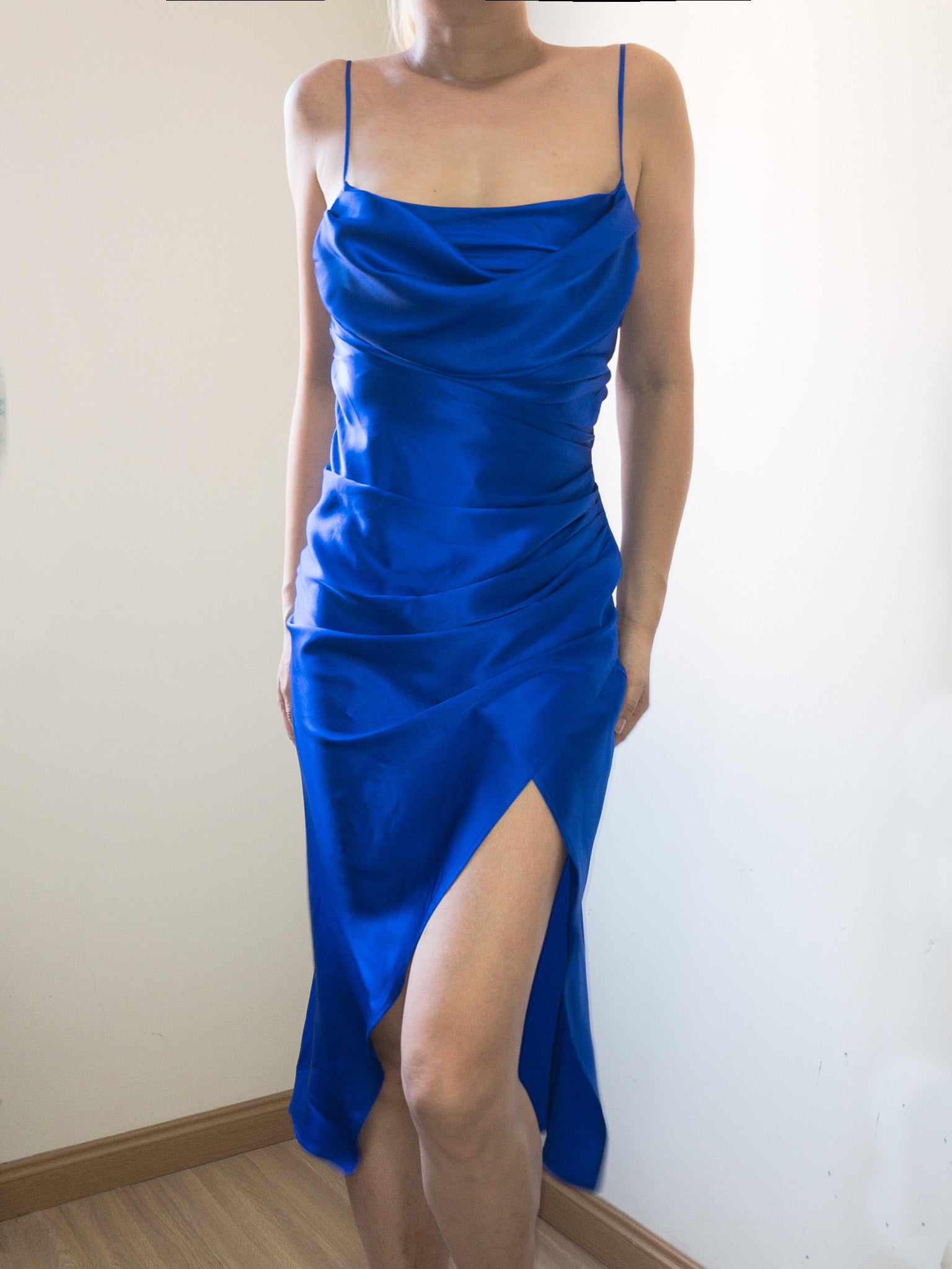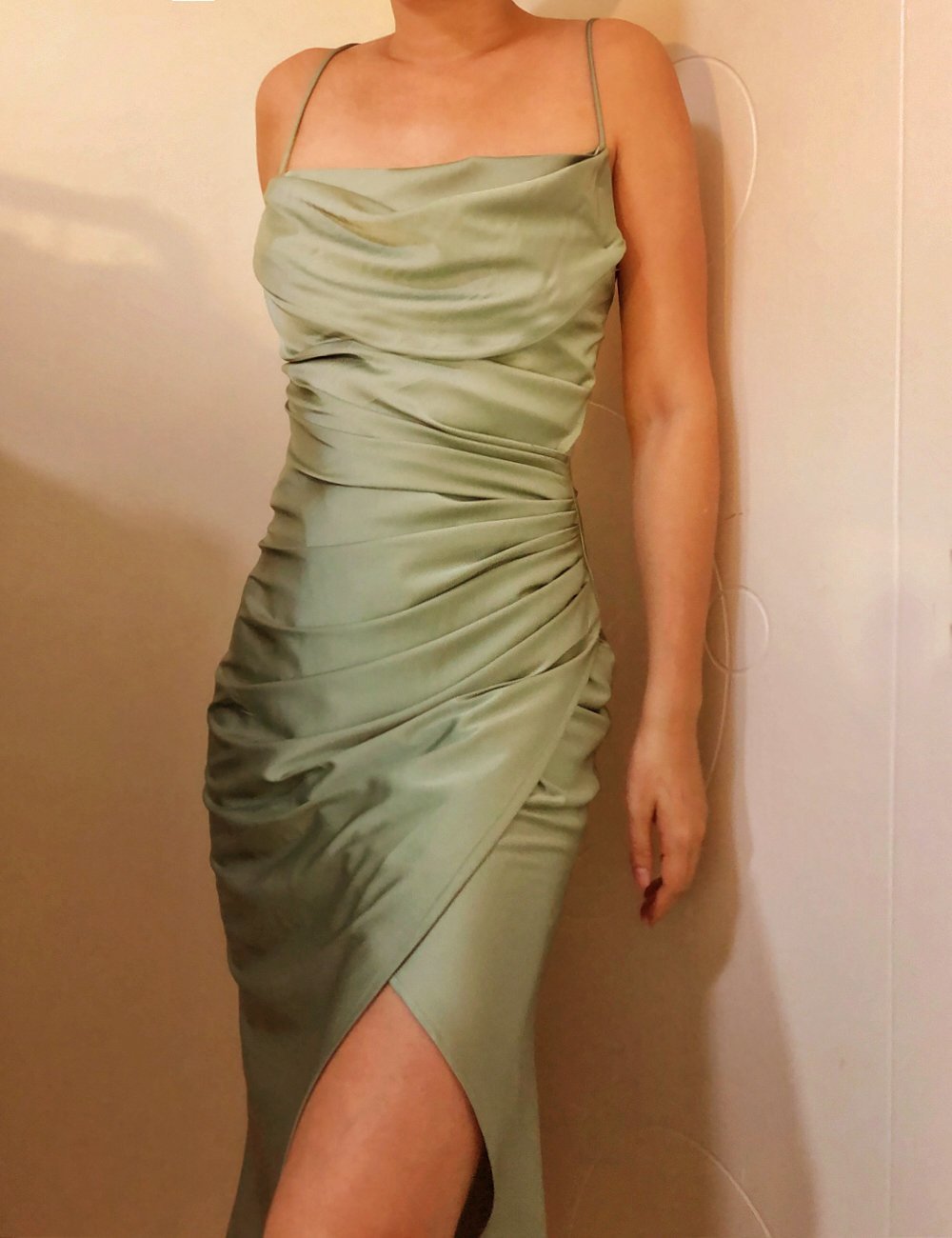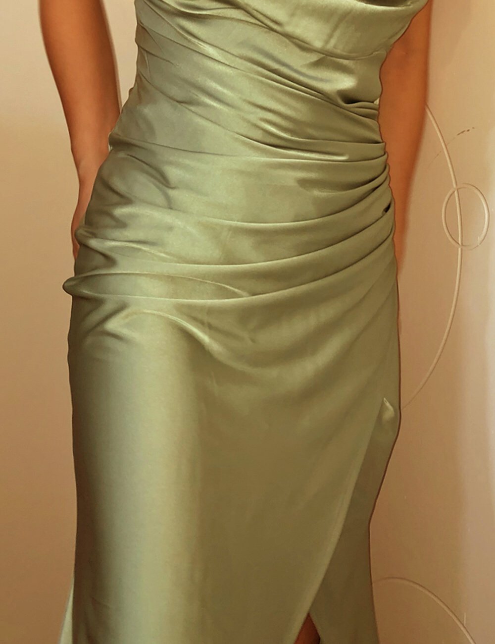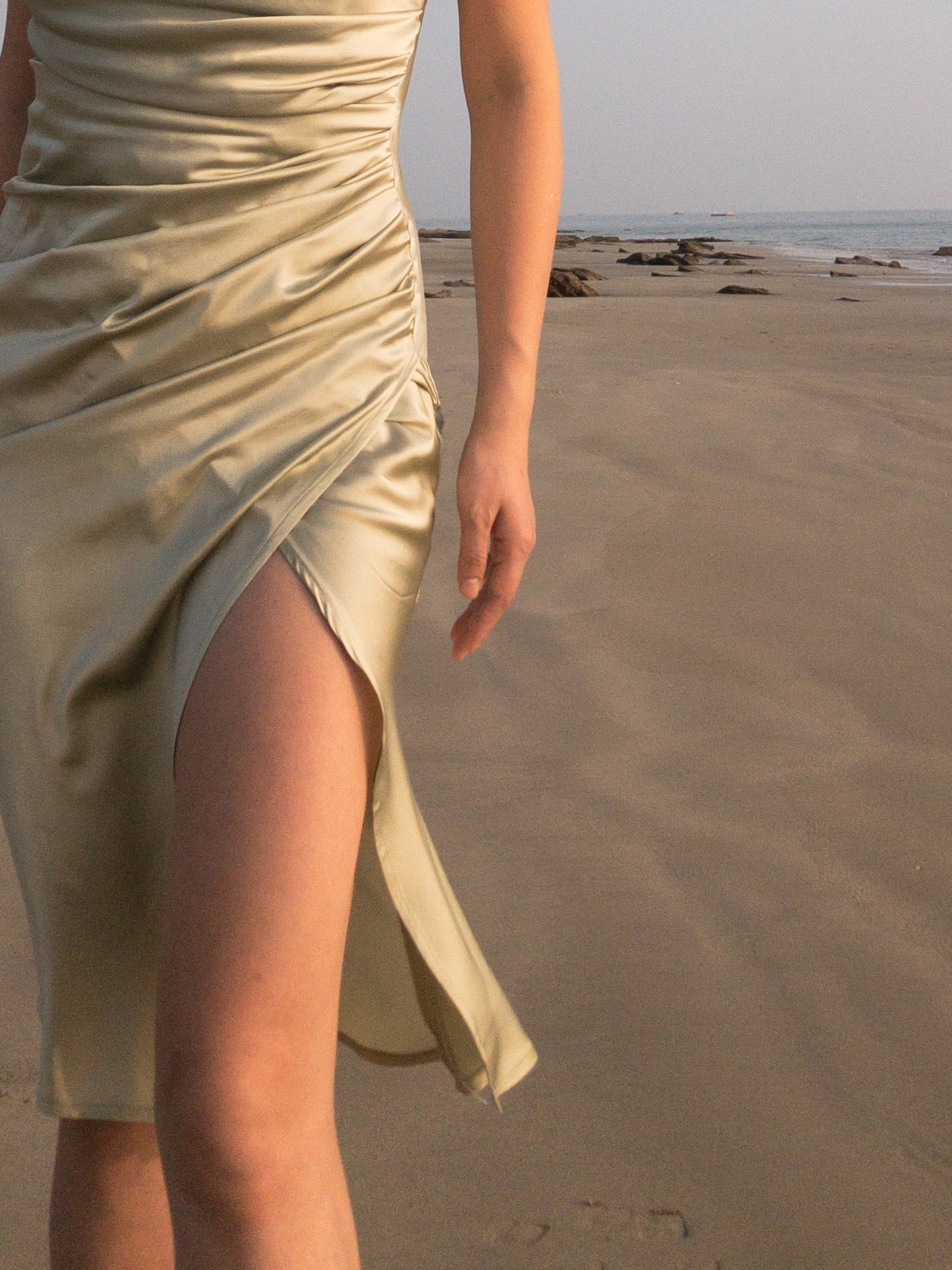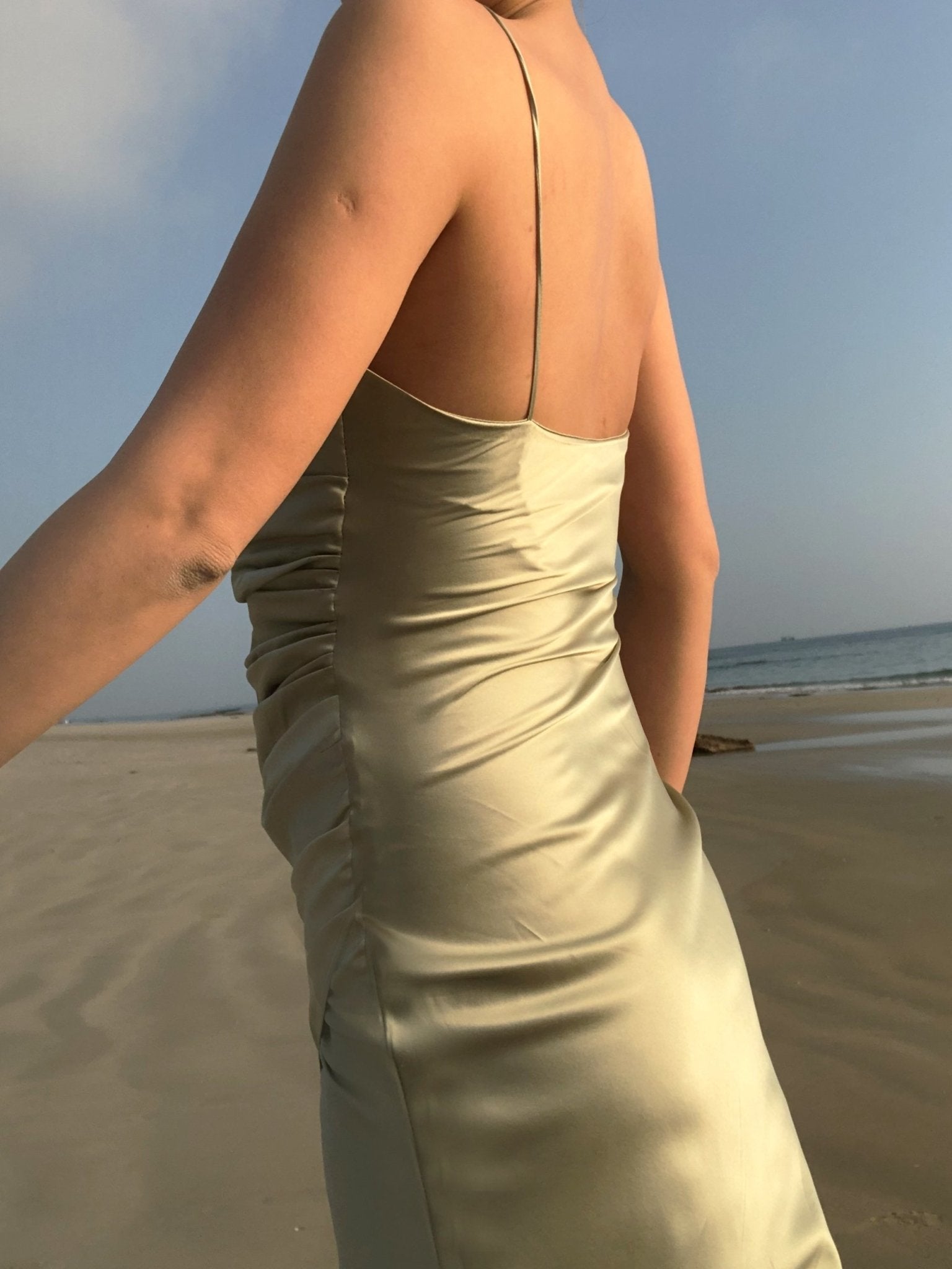Audrey dress is a lovely option for formal dinners or holiday parties. It's made from 100% mulberry silk with ruche detials that will catch the light beautifully. Featuring fine silk adjustable straps. front side slit and an elegance back. Audrey is for a natural beauty look. for luxury. and simplicity.