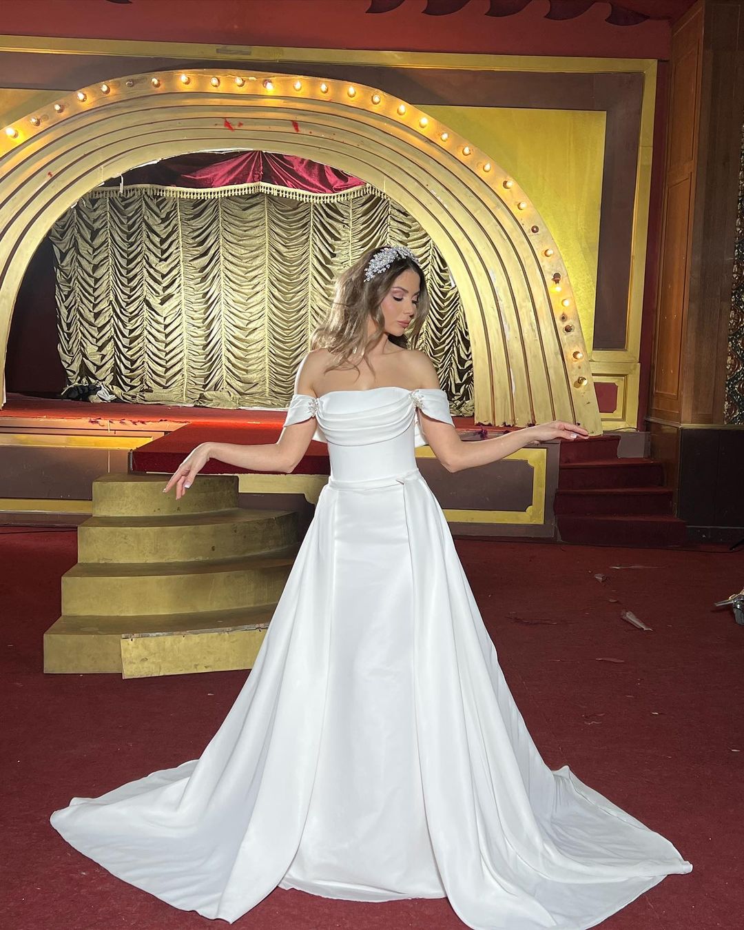 This chic long A-line wedding dress features an off-the-shoulder design and a detachable train for an elegant. timeless look. The sleeveless cut allows for a comfortable fit that showcases your curves. perfect for your special day.