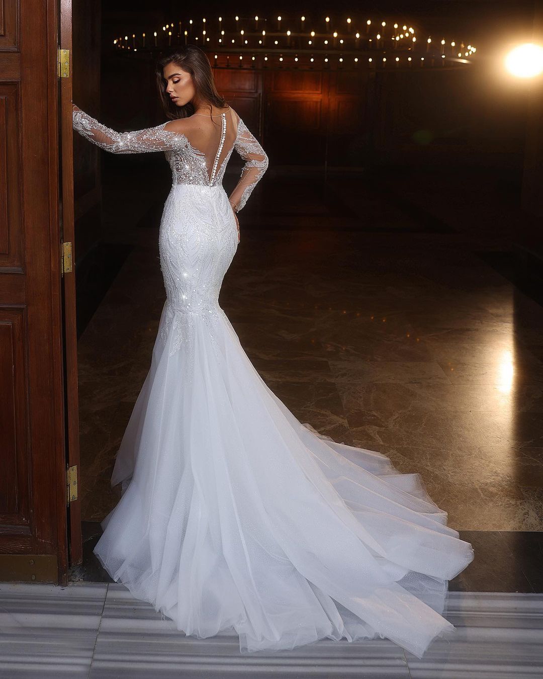 This elegant white wedding dress features a mermaid silhouette. long sleeves. and delicate lace and beading details on tulle fabric. Perfect for a modern and sophisticated bride looking for a timeless and chic look on her special day.