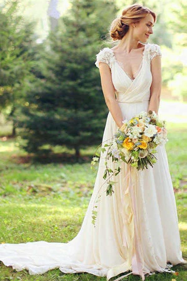 Deep V Neck Cap Sleeve Wedding Dresses Sheer Back Appliques Wedding Gown WD366